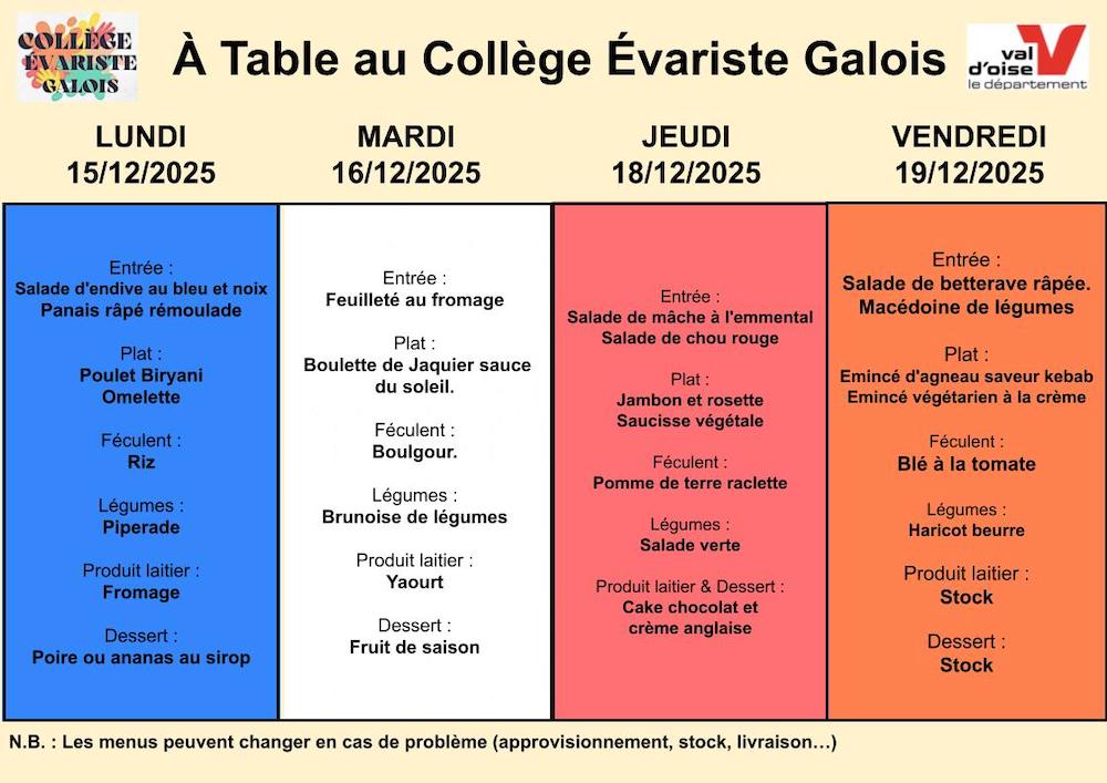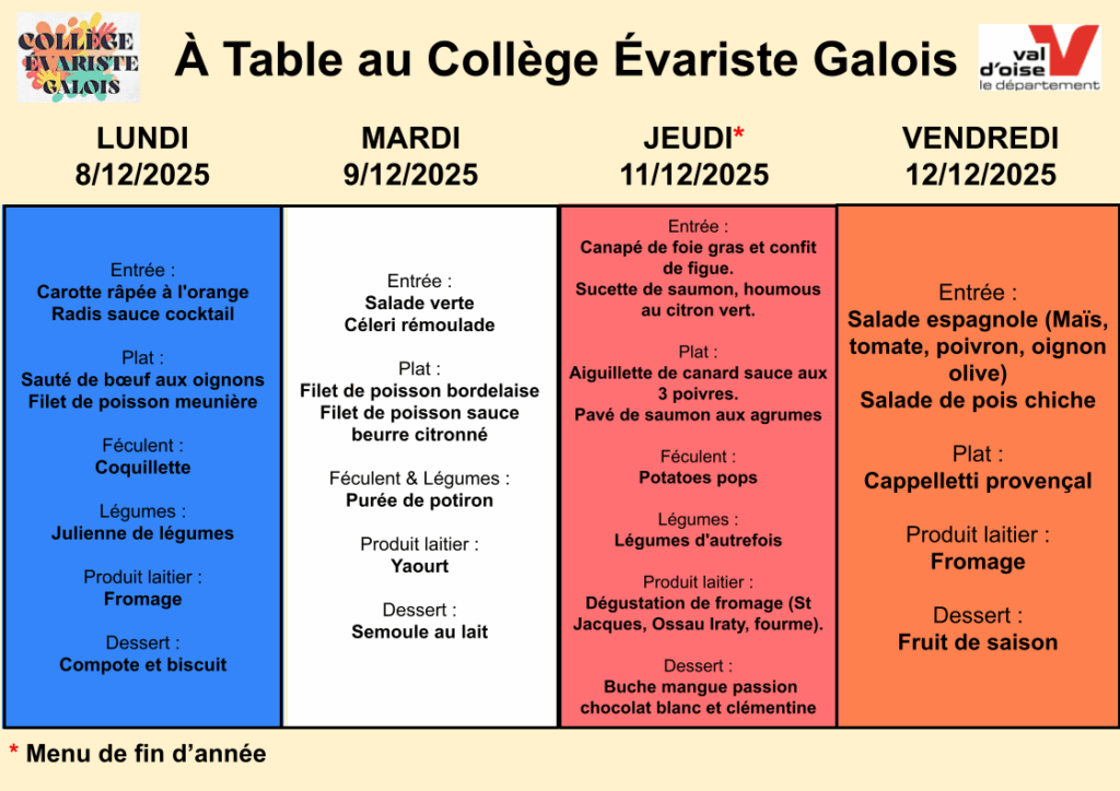 Le collège Évariste Galois vous propose chaque jour un repas équilibré et savoureux afin de partager un moment convivial et agréable durant la pause méridienne.