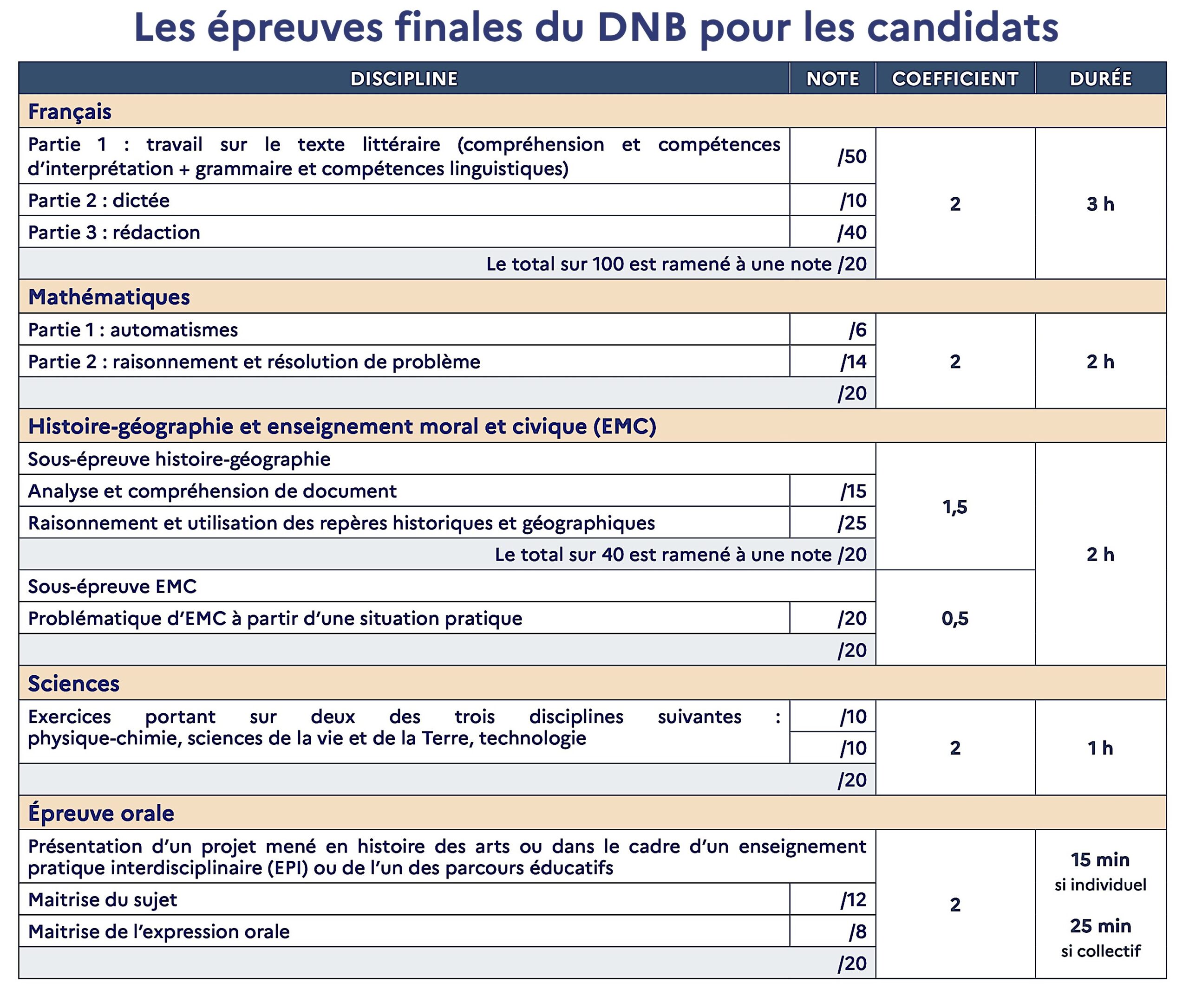 L’examen du diplôme national du brevet (DNB) comprend désormais cinq épreuves terminales :