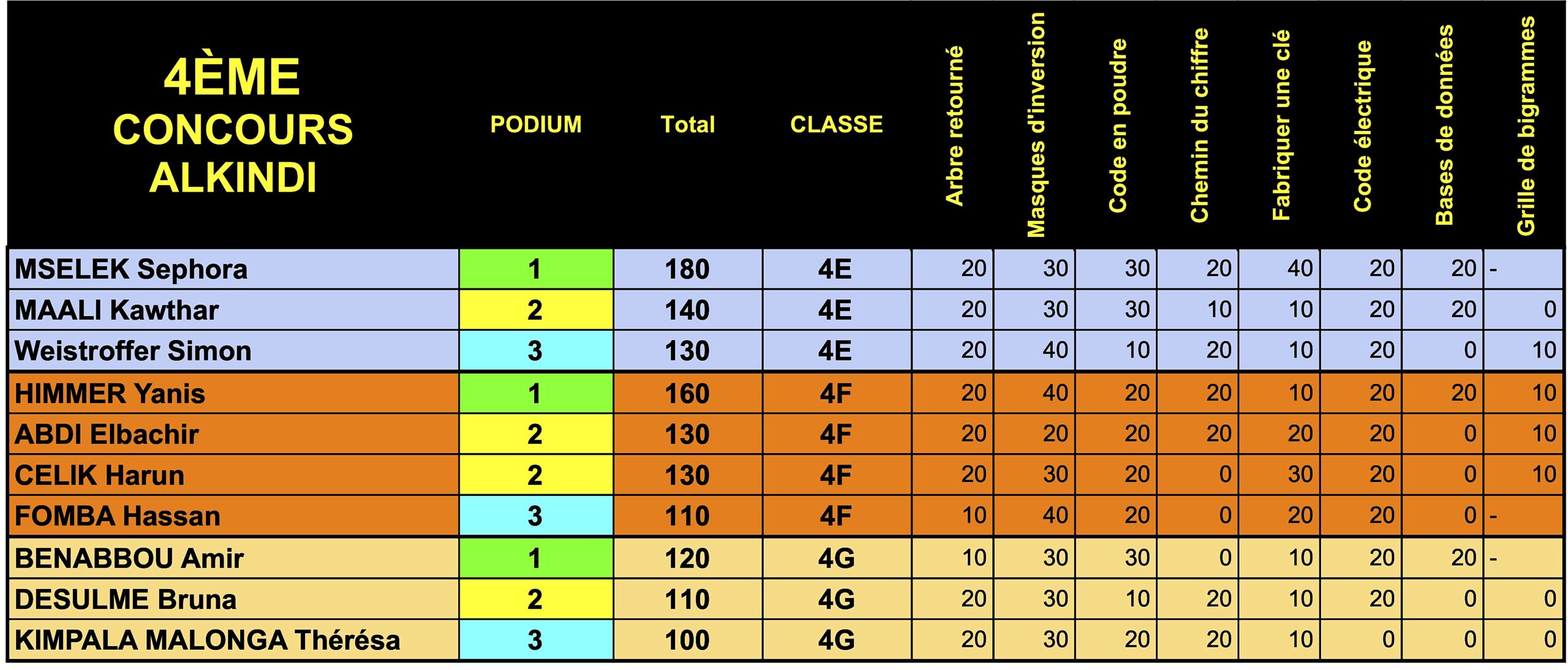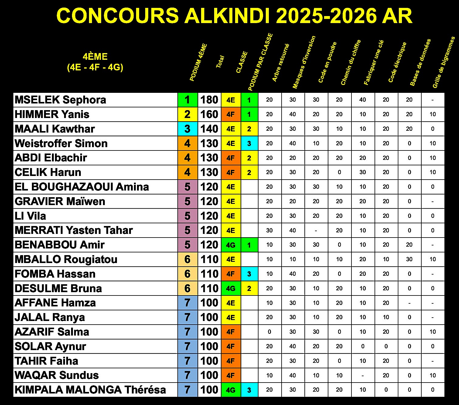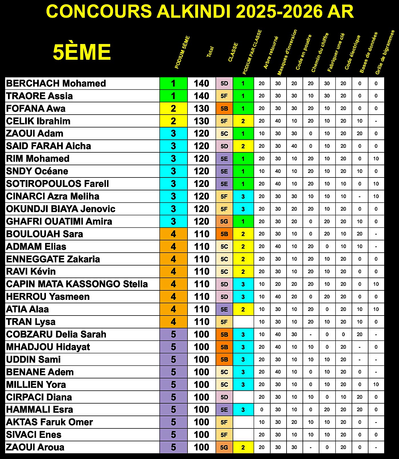 Nous adressons nos plus chaleureuses félicitations à l’ensemble des élèves ayant participé au premier tour du concours AlKindi pour la session 2025-2026. Ce concours de cryptographie, reconnu au niveau national, est habituellement ouvert aux classes de 4ᵉ, 3ᵉ et 2de. Cette année, nous avons fait le choix d’y associer également nos élèves de 5ᵉ, afin de leur permettre de découvrir cet univers stimulant et de relever un nouveau défi.
